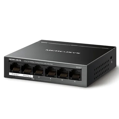The Mercusys MS106LP is a compact, unmanaged Fast Ethernet switch built for environments where power and data need to be delivered over the same cable. With 6 RJ-45 10/100 Mbps ports, this switch includes 4 PoE+ (802.3af/at) ports that supply both data and power to compatible devices like IP cameras, access points, or VoIP phones. The design is plug-and-play, requiring no configuration. Mercusys has added smart features like Extend mode (up to 250 m), isolation mode, and PoE auto recovery to make deployment easier and more resilient.