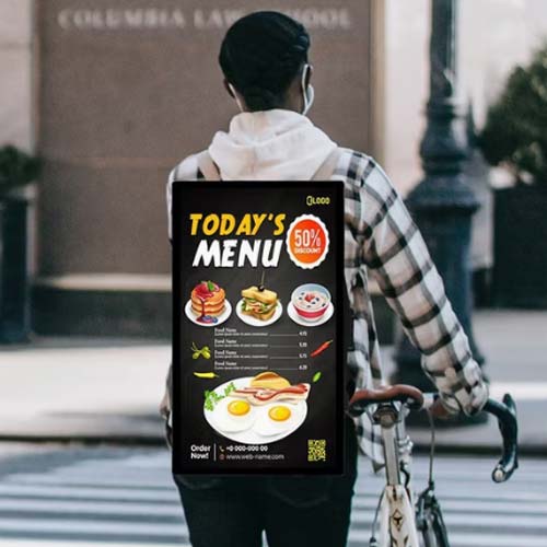 The display is powered by a built-in Android system, supporting offline and online media playback. You can update content via Wi-Fi, USB, SD card, or even optional 4G network support. The rugged yet lightweight aluminum frame is fitted with an ergonomic backpack harness that distributes weight evenly, allowing comfortable wear for several hours.